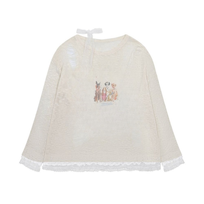 Charming Puppy Print Sweater with Tie Accent